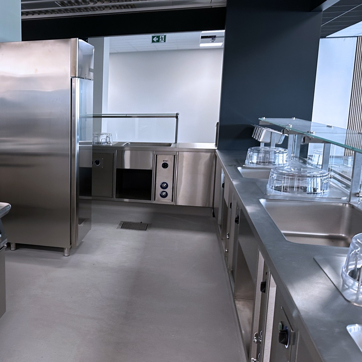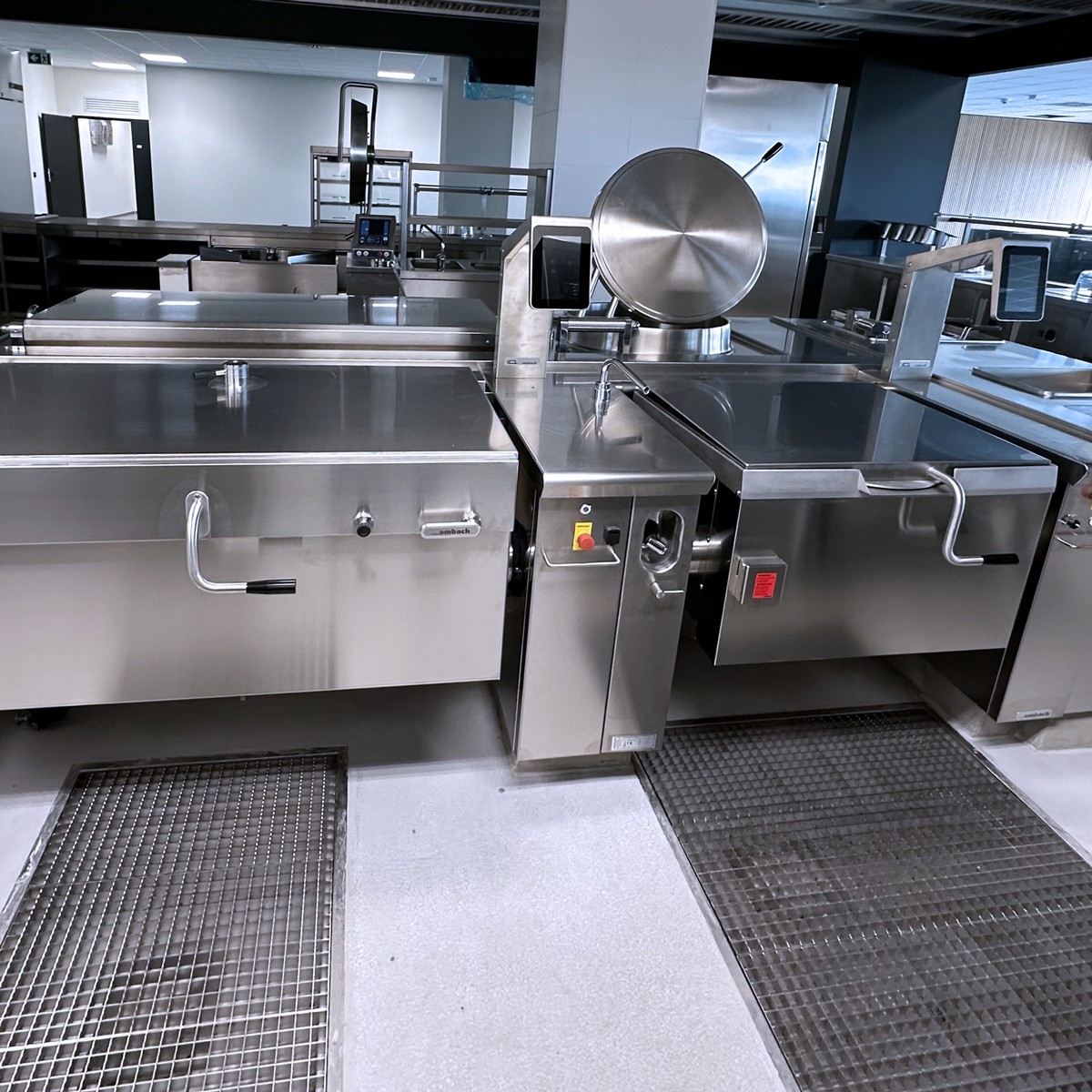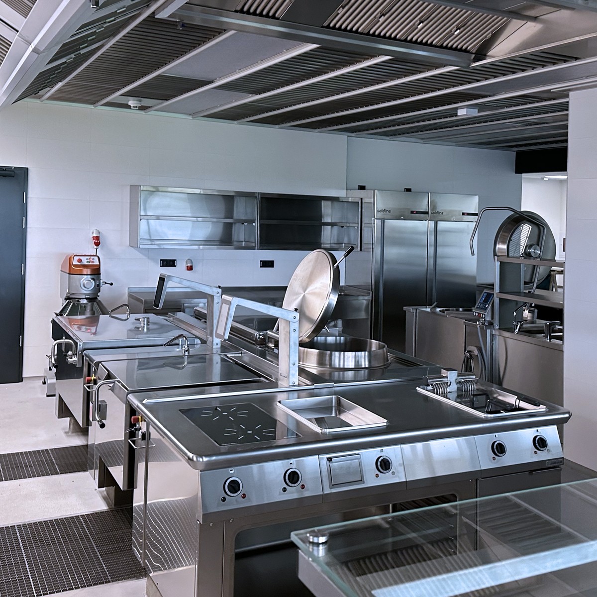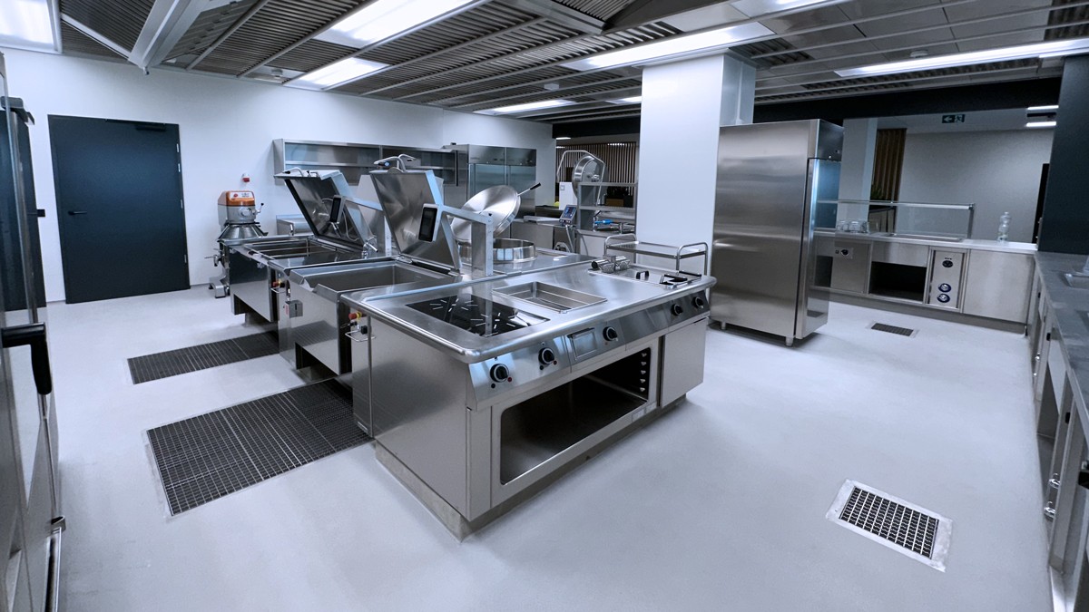 Totéž platí o varném bloku, který je osazen nejmodernější technologií multifunkčních pánví i tlakovými, velkokapacitními kotly. Špičkové konvektomaty Salvis jsou v těsné blízkosti bloku. Na jeho druhé straně je umístěn vynikající míchací kotel dánské firmy Joeni. Komfortní výdejní linky jsou osazeny výdejními prvky moderní a úsporné konstrukce. Chladící systém je řešen jako centrální koncept se špičkovými boxy se zámkovým systémem pro minimálními tepelnými ztrátami.