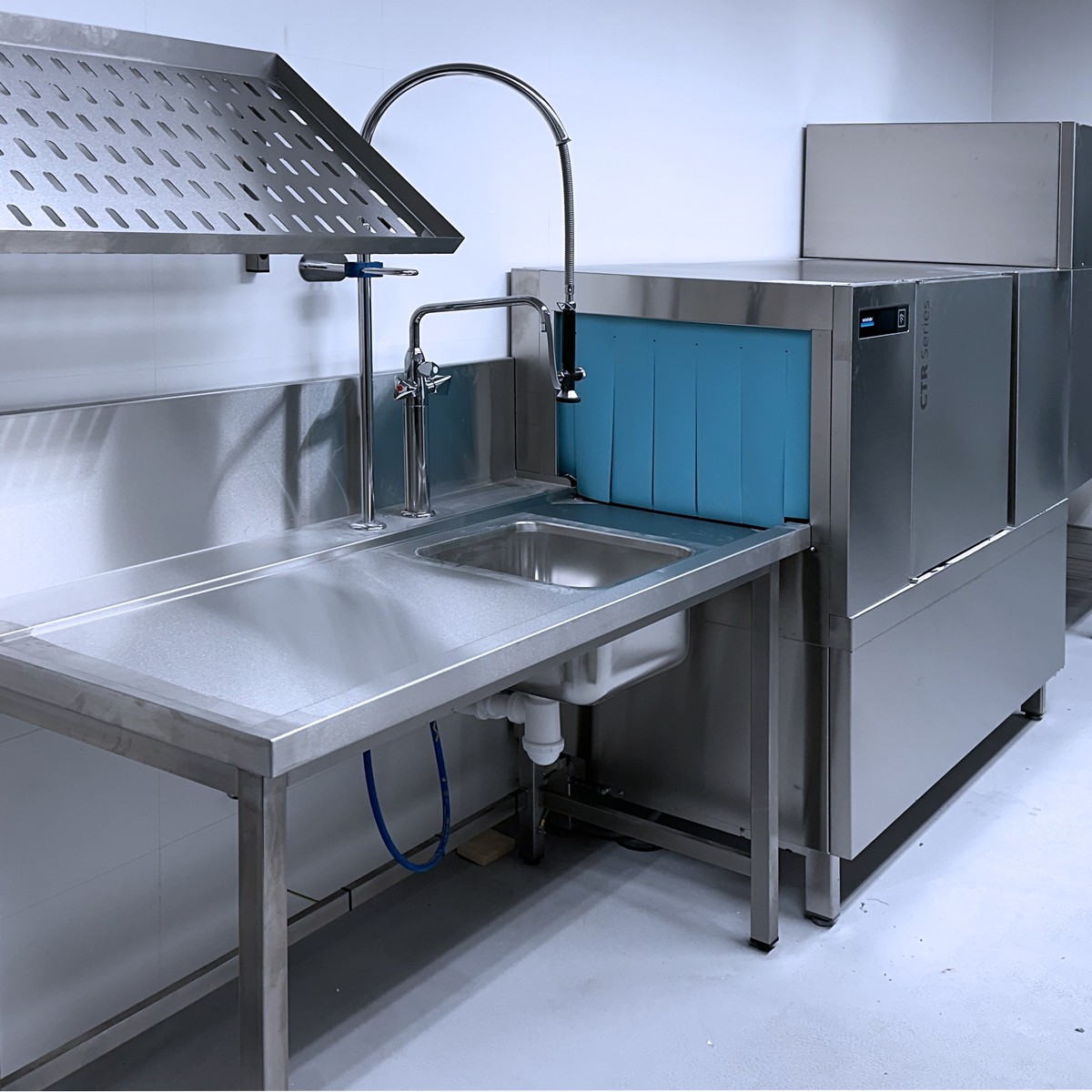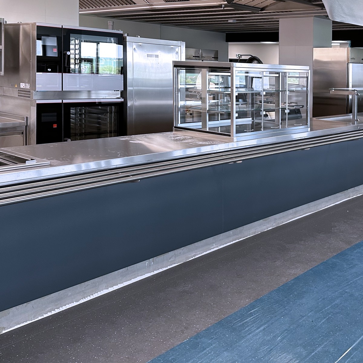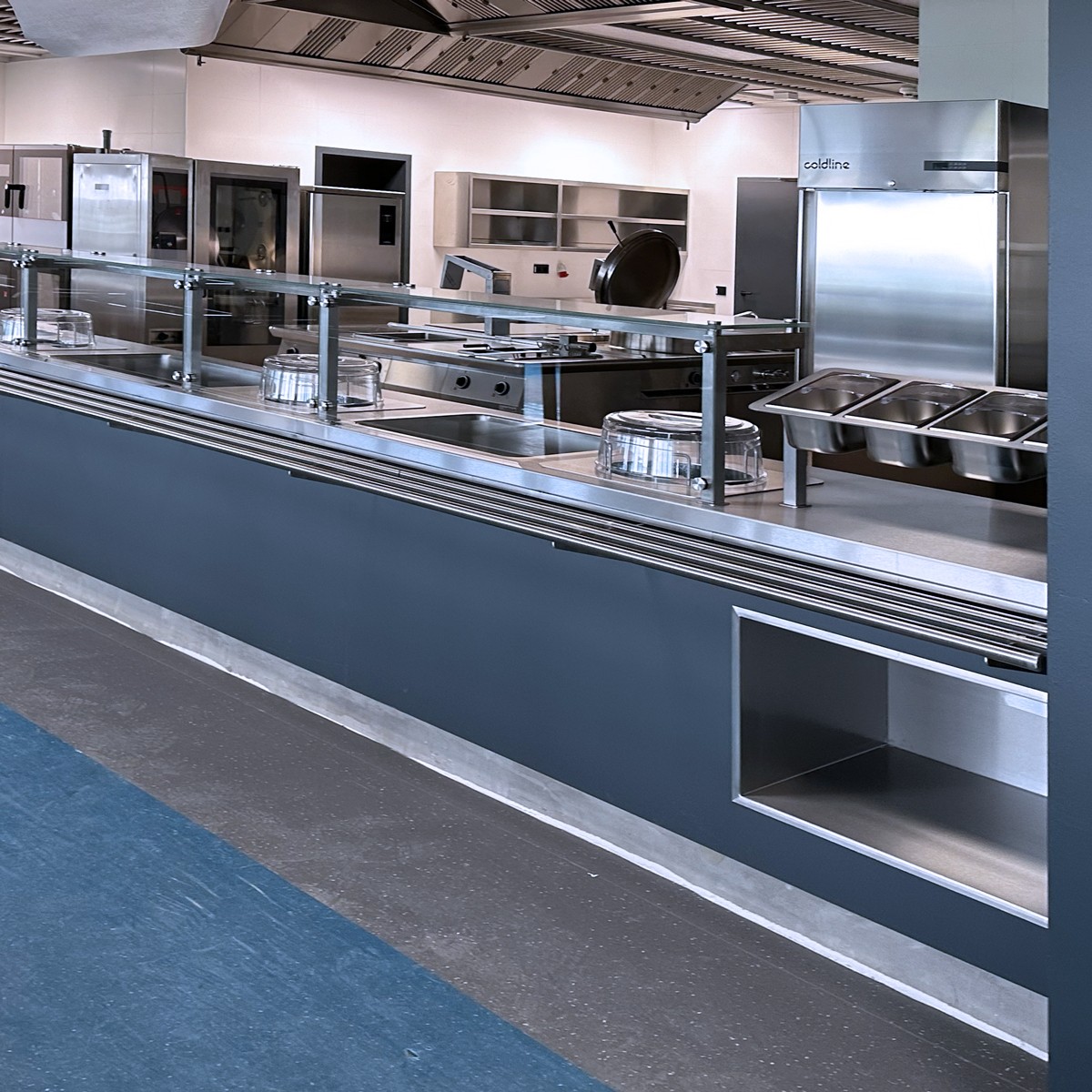 Totéž platí o varném bloku, který je osazen nejmodernější technologií multifunkčních pánví i tlakovými, velkokapacitními kotly. Špičkové konvektomaty Salvis jsou v těsné blízkosti bloku. Na jeho druhé straně je umístěn vynikající míchací kotel dánské firmy Joeni. Komfortní výdejní linky jsou osazeny výdejními prvky moderní a úsporné konstrukce. Chladící systém je řešen jako centrální koncept se špičkovými boxy se zámkovým systémem pro minimálními tepelnými ztrátami.