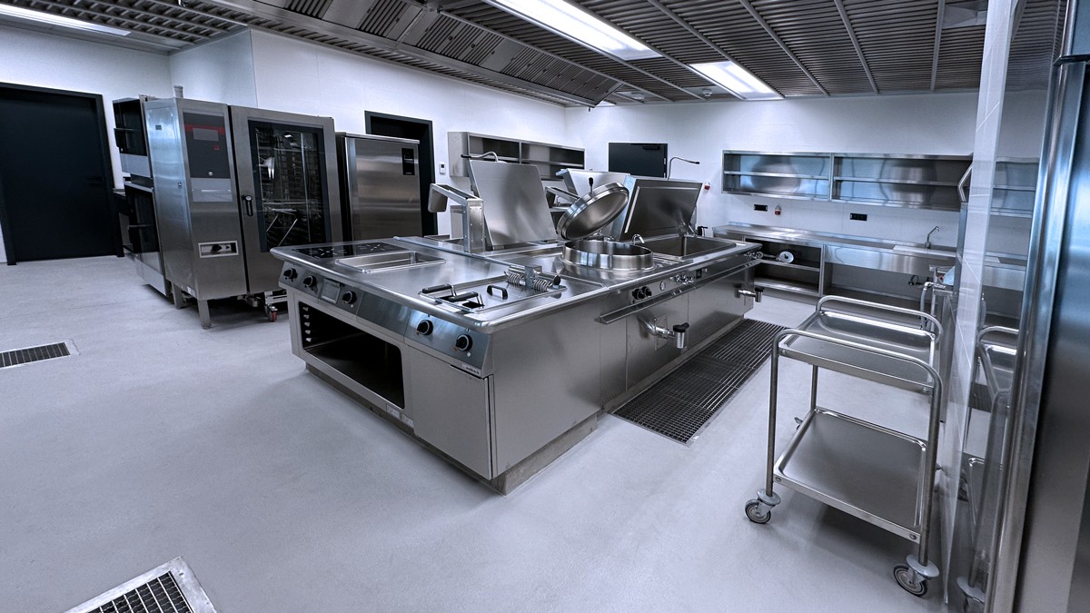který je osazen nejmodernější technologií multifunkčních pánví i tlakovými, velkokapacitními kotly. Špičkové konvektomaty Salvis jsou v těsné blízkosti bloku. Na jeho druhé straně je umístěn vynikající míchací kotel dánské firmy Joeni. Komfortní výdejní linky jsou osazeny výdejními prvky moderní a úsporné konstrukce.