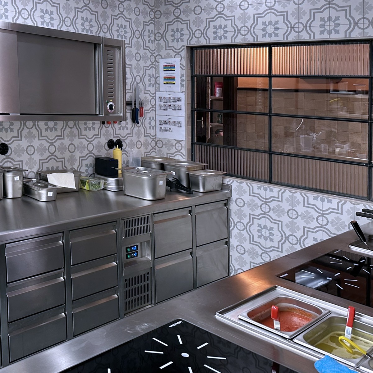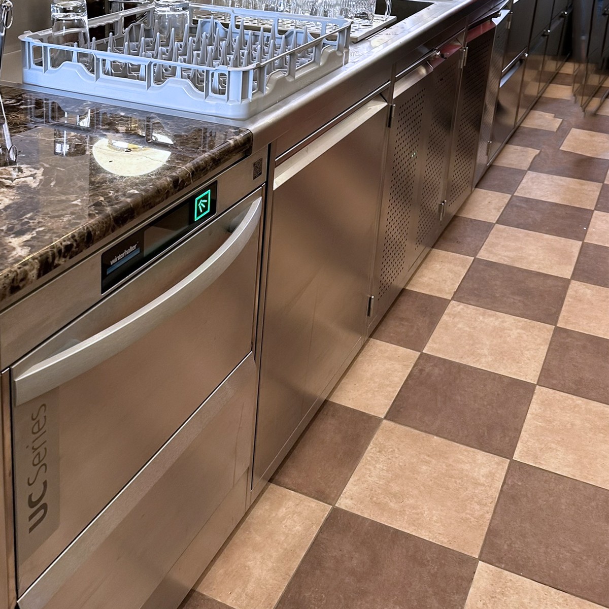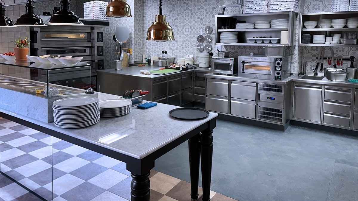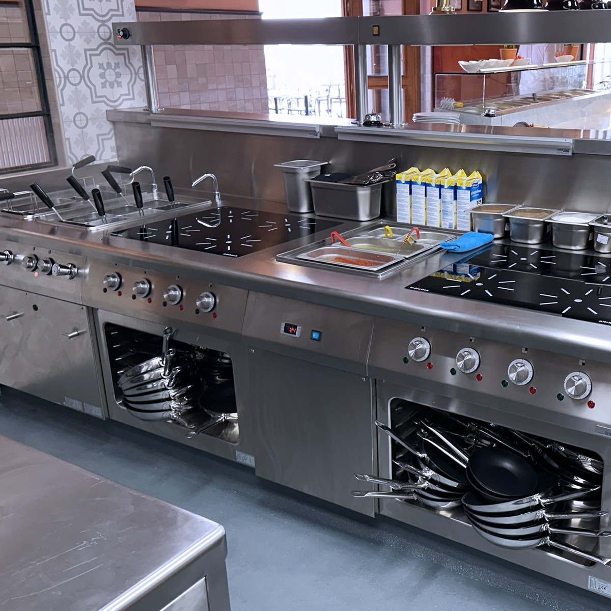 a oba bary ve špičkové kvalitě odpovídající úrovni sítě restaurací L´Osteria. Opět je využit varný blok Ambach a mytí od Winterhalter. Špičkové je provedení nerez zástavby a komplikované bylo i řešení chladícího systému. Nakonec je využito i zpětného získávání tepla pro ohřev TUV.