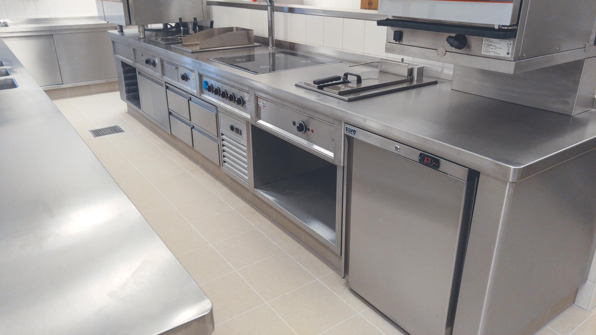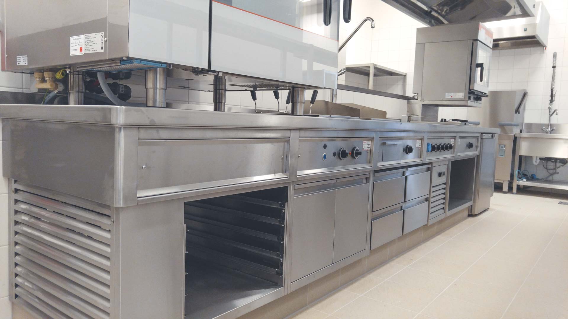 Dodali jsme špičkové technologie, švýcarské konvektomaty Salvis (i s logem FC Viktoria na displeji), varné technologie Berner, mycí stroje Winterhalter a nerez zástavbu Anticoro, vč. varného bloku pod jednou deskou. Zchlazovač pochází od výrobce Coldline.